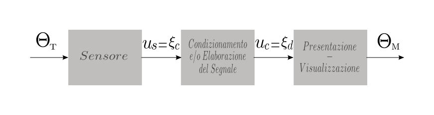 Nel seguito adotteremo la convenzione di indicare con la lettera greca chi (ξ) le grandezze in ingresso ai singoli blocchi funzionali e con la lettera u le rispettive uscite. I simboli ΘT eΘM saranno invece riservati all'ingresso e all'uscita del sistema di misura completo, sottintendendo il fatto che si tratta di grandezze omogenee, dunque con le medesime dimensioni fisiche.