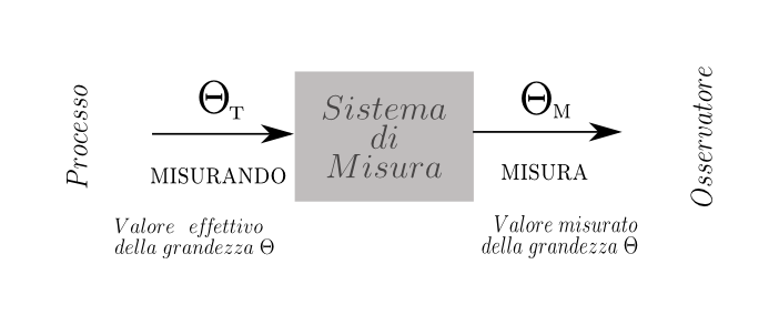 Il sistema di misura può essere visto come un tramite tra il processo fisico associato alla grandezza di cui si vuole conoscere il valore (la grandezza misuranda ΘT, dove il pedice T per 'true' sottolinea il valore 'vero' o effettivo della grandezza) e l'osservatore o fruitore della misura, rappresentata dalla grandezza ΘM. Se il sistema di misura è completo, ΘT e ΘM sono grandezze fisiche omogenee (ad esempio due temperature, due resistenze, due intensità luminose...).
