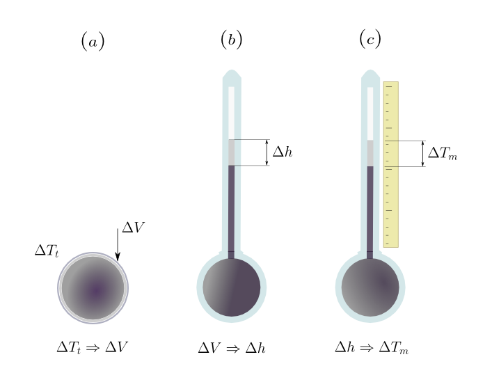 Ad esempio, nel caso del termometro, il mercurio del bulbo trasforma la variazione di temperatura ΔTt in una variazione ΔV del suo volume. Il capillare permette di passare dalla variazione di volume alle variazione di altezza Δh della colonna di liquido. Il sottostistema costituito da bulbo e capillare trasforma così un cambiamento di temperatura in un cambiamento di livello. Lo stadio finale di visualizzazione ha il compito di tradurre il tutto nelle dimensioni della grandezza misurata, passando di fatto dai mm ai gradi della scala di temperatura