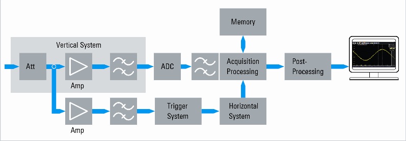 Il segnale misurato all'ingresso dell'oscilloscopio è condizionato dal sistema verticale. Il convertitore analogico-digitale (ADC), nella sezione di acquisizione del segnale all'interno del diagramma, campiona il segnale a intervalli di tempo regolari e converte le loro rispettive ampiezze in valori numerici discreti chiamati "campioni" (sample).