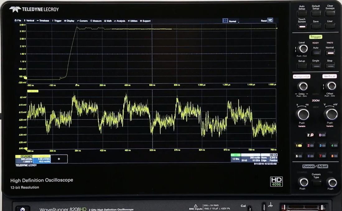 Un oscilloscopio HD permette di osservare notidamente anche piccole variazione di segnale (finestra inferiore) sovrapposte a un segnale di maggiore ampiezza variabile lentamente (finestra superiore)All'atto pratico, un oscilloscopio ad alta definizione risulta particolarmente utile quando si devo osservare i dettagli di piccole variazioni di segnale piuttosto veloci sovrapposte a segnali di ampiezza molte maggiore variabili più lentamente.