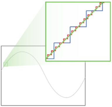 L’inserto nella figura rappresenta è un ingrandimento della porzione di una forma d’onda sinusoidale, ideale e senza rumore. Possiamo vedere l’errore causato dal campionamento di questa forma d’onda causato dagli ADC con differenti risoluzioni.