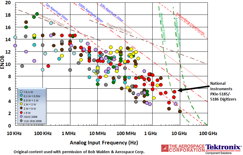 Le prestazioni del convertitore ADC di Tektronix possono essere confrontate con alternative disponibili sul mercato tramite il parametro di merito di riferimento per la tecnologia ADC ad alta velocità, ovvero il numero effettivo di bit (ENOB). Il confronto in Figura 3 mostra i dati raccolti da Bob Walden di The Aerospace Corporation in una recente analisi sulla tecnologia ADC.