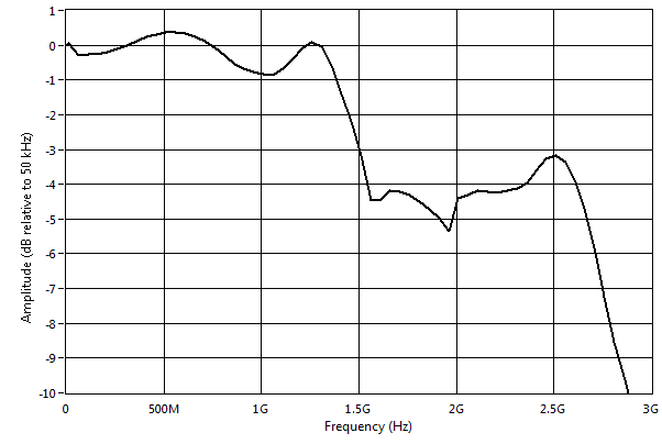 Per facilitare il confronto e dimostrare le prestazioni ottenute utilizzando lo stadio di ingresso ASIC sviluppato da Tektronix, la Figura 2 mostra la risposta in frequenza del digitalizzatore PXIe-5186 National Instruments. Il grafico della Figura 2 è chiaramente incluso nel documento delle specifiche del digitalizzatore.