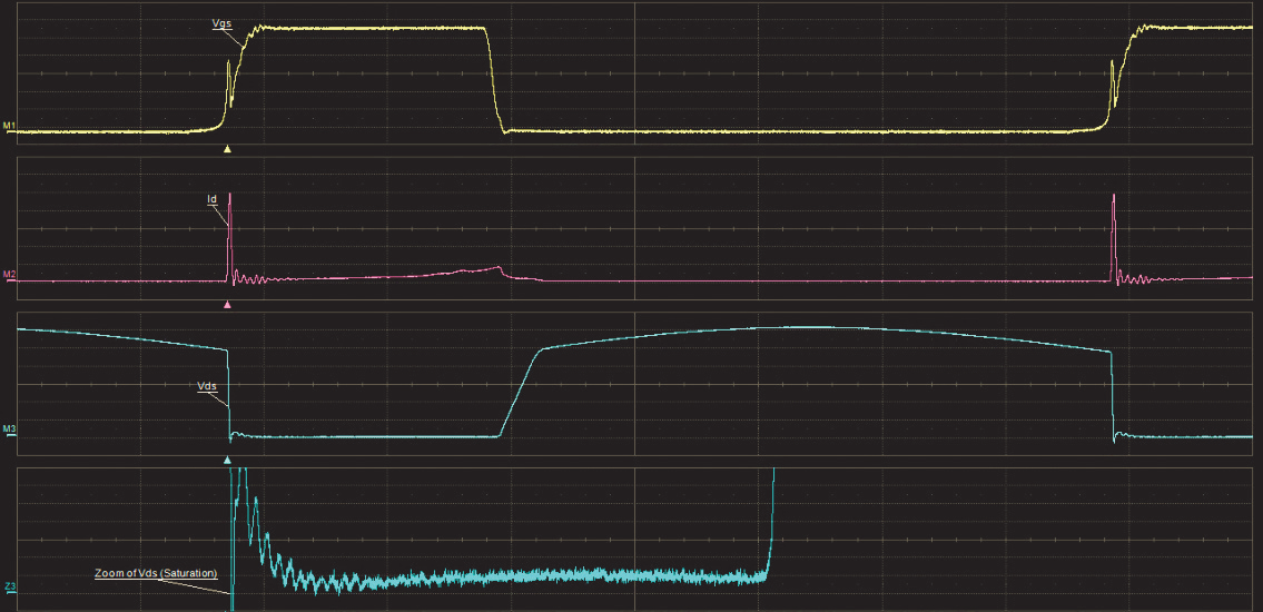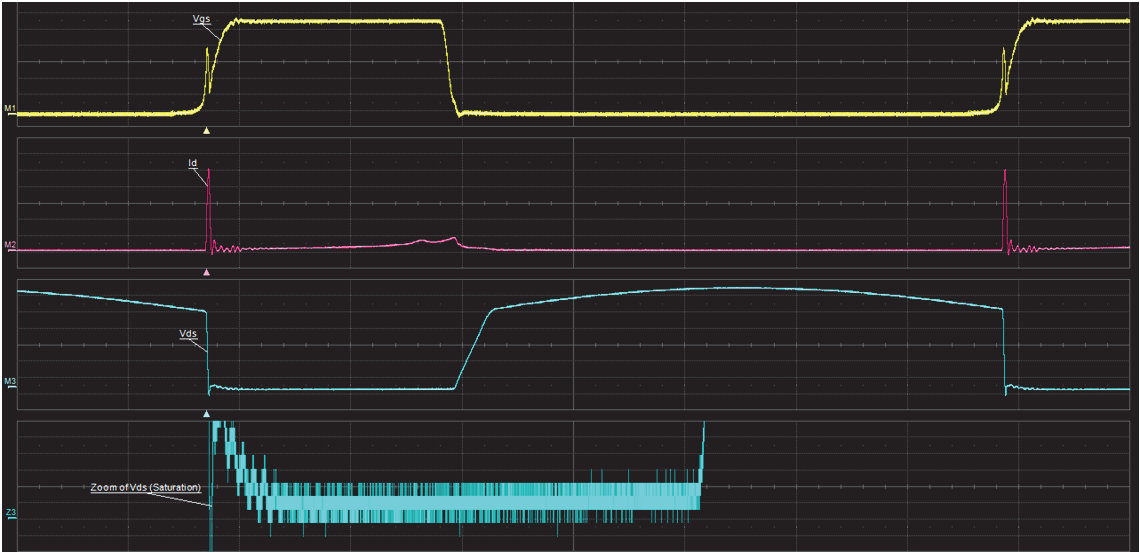 Le note aree turn-on, turn-off e condution loss sono identificate con sovrapposizioni di forme d'onda di differenti colori codificati.