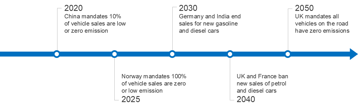Le crescenti preoccupazioni per i cambiamenti climatici spingono verso normative rigorose sull'efficienza dei consumi in vista di una riduzione delle emissioni di CO2. Inoltre molti governi stanno per introdurre limitazioni o persino il divieto alla vendita di veicoli con motore a combustione. Per esempio Germania e Regno Unito hanno stabilito che la vendita di veicoli diesel o benzina verrà terminata, rispettivamente, entro il 2030 e il 2040.