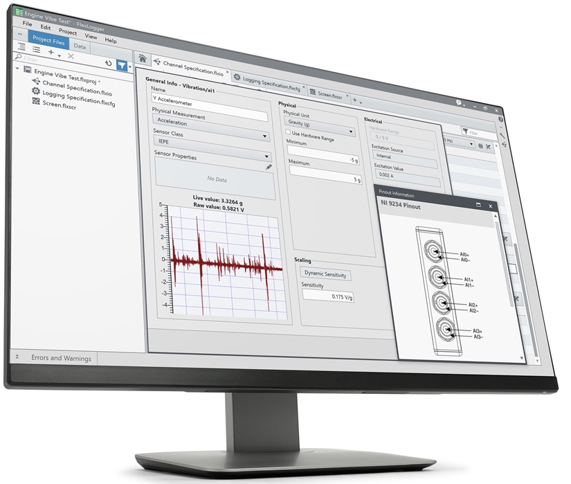 Con FlexLogger, la configurazione dei test viene semplificata per mezzo di strumenti di sviluppo specifici per ogni sensore che acquisiscono e registrano in maniera sincronizzata diversi tipi di misura, senza bisogno di programmazione.