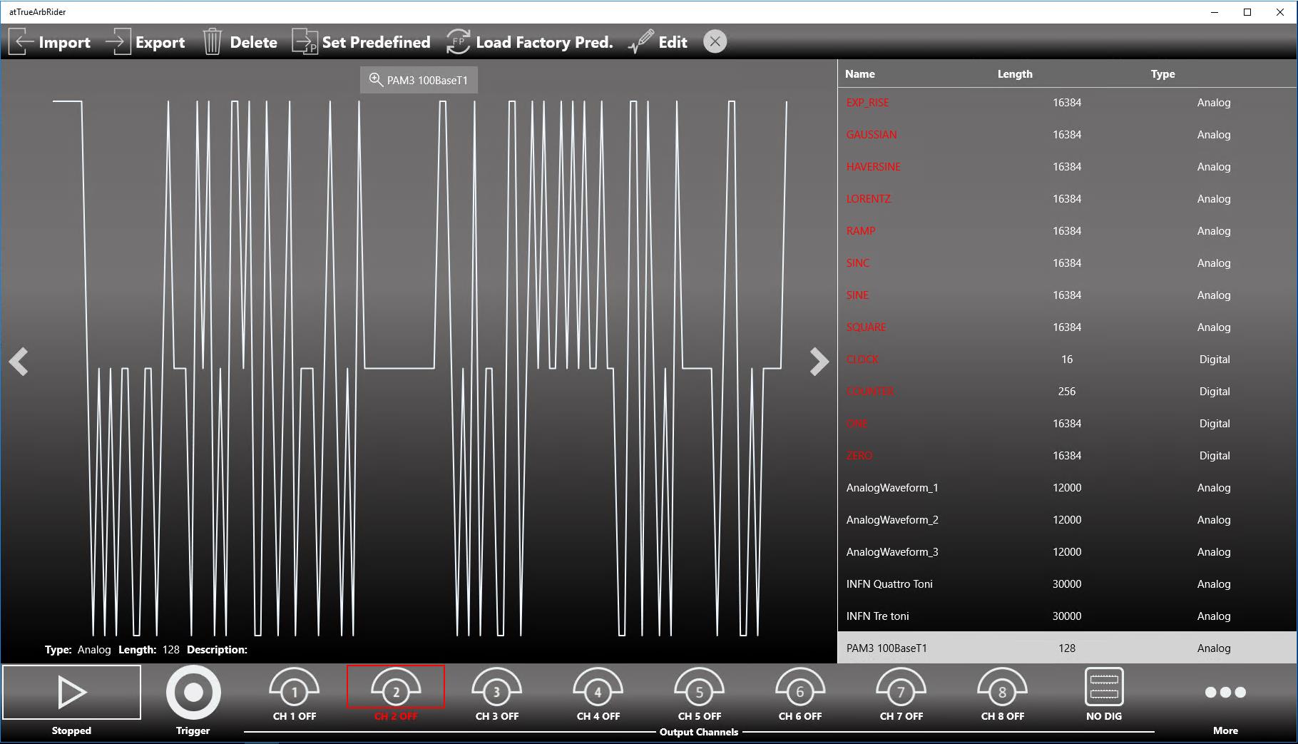 Utilizzando il generatore T3AWG3K in modalità AWG possiamo creare molto facilmente un segnale di stimolo PAM3 pseudocasuale utilizzando il Waveform Editor.