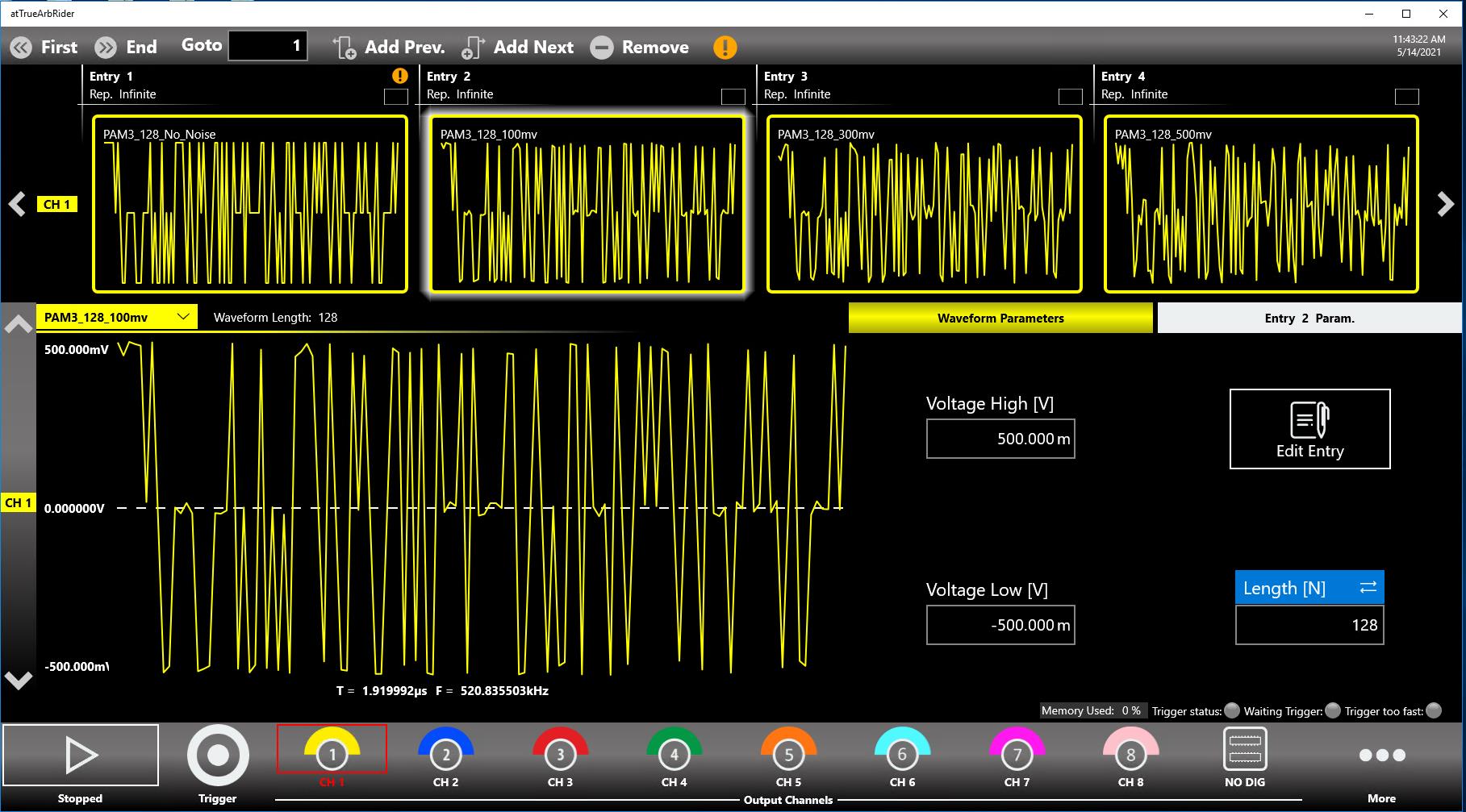 Ipotizziamo di voler generare una sequenza di segnali di stimolo composta da una forma d’onda pseudocasuale PAM3 pulita, seguita da una forma d’onda analoga ma affetta da rumore, una successiva affetta da rumore ancora più forte e così via.