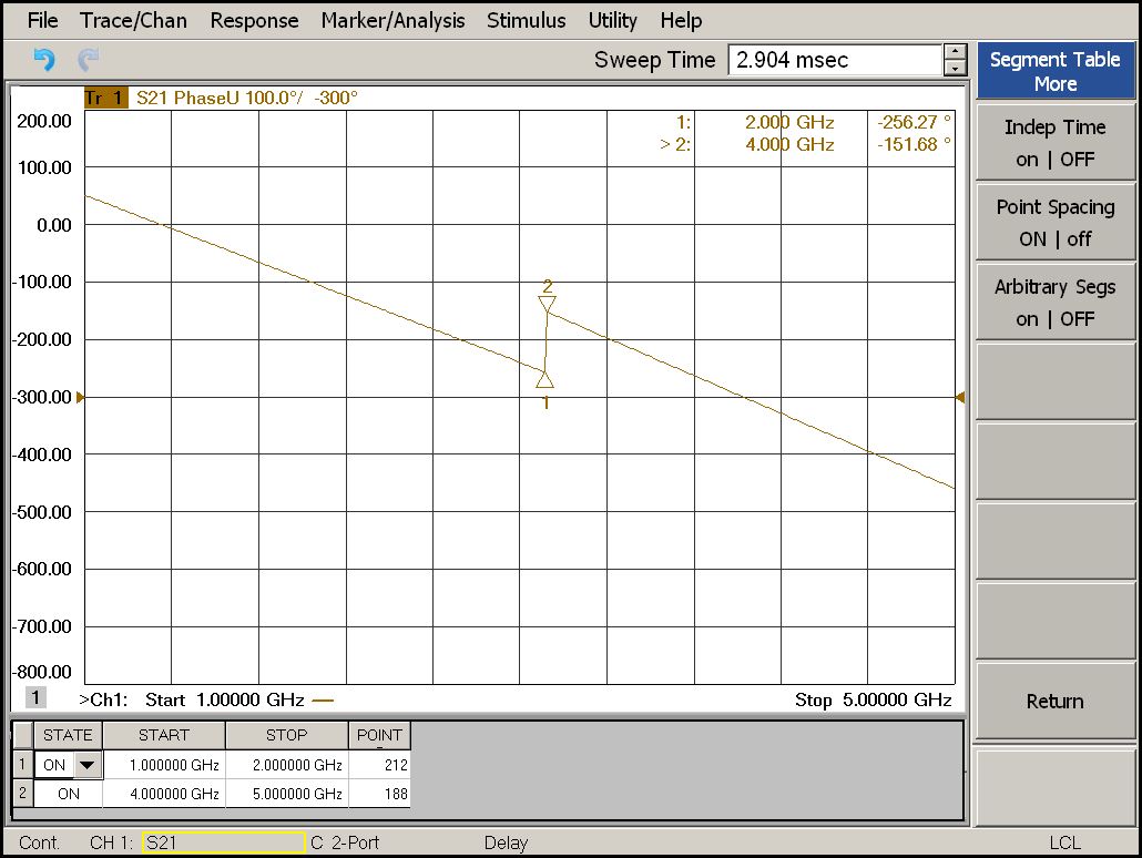 Di conseguenza l’intervallo di non ambiguità della traccia complessiva sarà efficacemente esteso al minimo comune multiplo degli intervalli. Immaginiamo ad esempio di voler misurare un ritardo di 1000 ns di un dispositivo con delle perdite di inserzione sufficientemente basse nell’intervallo da 1 a 5 GHz.