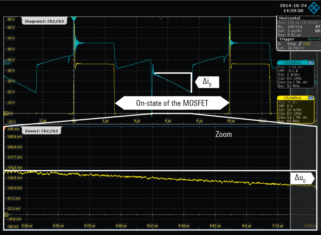 Un esempio applicativo che sfrutta i vantaggi offerti dalla modalità HD è la misura in condizioni dinamiche della resistenza di conduzione RDS(on) di un MOSFET di potenza, ad esempio utilizzato in un alimentatore a commutazione.