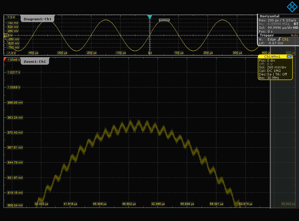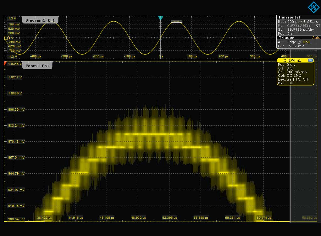 Si può allora attivare la modalità HD sugli oscilloscopi R&S RTO e R&S RTE impostando la frequenza di taglio al minimo possibile per aumentare al massimo la risoluzione, ma tenendo conto della larghezza di banda del segnale, per evitare di distorcerlo impostandola ad un valore troppo basso.