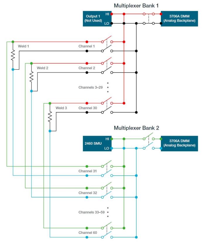 Il modello 3706A è dotato di un multimetro digitale (DMM) a 7,5 cifre e può misurare decine di nanovolt nella gamma dei 100 mV. Poiché un pacco batterie potrebbe avere quasi 80 saldature su una sbarra collettrice, la soluzione proposta da Tektronix Keithley supporta mainframe con slot configurabili per ospitare moduli plug-in multicanale, eliminando la necessità di ricablaggio. Il processo di chiusura di ogni canale per effettuare la misura è naturalmente automatizzato per massimizzare velocità ed efficienza.
