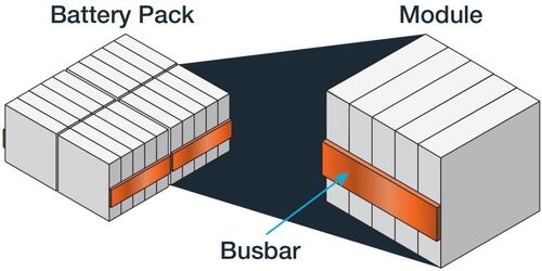 Le molteplici celle che compongono un modulo batteria vengono collegate tra loro in parallelo o in serie per ottenere la tensione di uscita desiderata. Tutte le celle sono saldate al laser ad una sbarra collettrice (busbar), un lungo conduttore isolato da terra che raccoglie e trasporta l’elevata corrente erogata dalla singole celle che collettivamente costituiscono il modulo.
