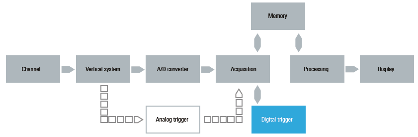 Gli oscilloscopi digitali convenzionali utilizzano un architettura di trigger di tipo analogico. In sostanza, il circuito di ingresso dello strumento suddivide il segnale entrante da misurare in due cammini separati: quello di acquisizione e quello di trigger.