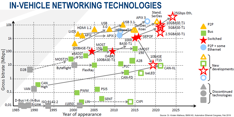 Ethernet è entrata nel mondo automotive intorno al 2005 con le prime porte di connessione standard 100Base-T a 100 Mbit/s utilizzate sostanzialmente per la diagnostica in officina. Intorno al 2010 hanno cominciato a diffondersi soluzioni a 100 Mbit/s specificatamente pensate per il mercato automotive, come lo standard 100Base-T1 (note anche come BroadR-Reach) funzionante su un singolo doppino non schermato (diventato lo standard Ieee 802.3bw Clause 96).