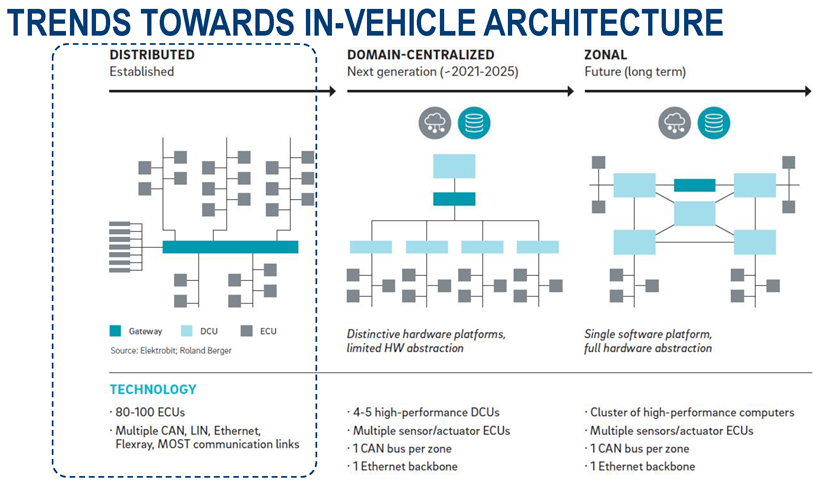 Oggi si sta passando ad un’architettura più centralizzata, con diversi potenti “controllori di dominio" che coordinano le informazioni provenienti da una determinata area del veicolo. Si prevede che all’interno dei veicoli moderni ci saranno tipicamente quattro o cinque domain controller, ciascuno dei quali raccoglierà i dati da una rete CAN e da una dorsale Ethernet. Uno di essi, ad esempio sarà dedicato a infotainment, uno alla comunicazione con l’esterno, un altro alla trazione e altri ancora alle altre funzioni necessarie a seconda del tipo di veicolo.