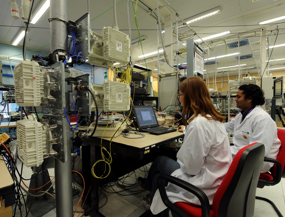Circa 160 progettisti e ricercatori sono impegnati nel laboratorio Microwave di Vimercate, un polo di eccellenza riconosciuto in tutto il mondo nell’industria delle telecomunicazioni. Qui, già negli anni ’60 nascevano i ponti radio per la radiodiffusione televisva e, dal 1967, per le reti di telecomunicazione, con sistemi a breve e a lunga distanza, a bassa e ad alta capacità, dai ponti radio da 2 Mbit/s per uso locale ai sistemi con capacità di centinaia di Mbit/s al secondo per applicazioni di trasporto a lunga distanza e impiegati anche nelle aree più impervie del pianeta.