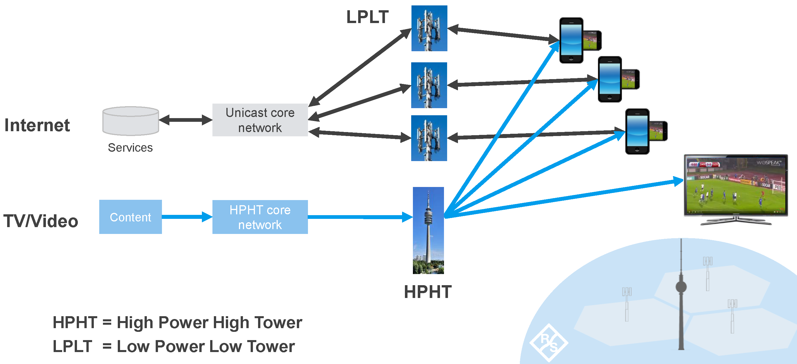 Le reti terrestri per servizi broadcast TV e radio tradizionali sono generalmente costituite da un relativamente numero limitato di torri di alta potenza (HPHT, High Power High Tower) poste su alture naturali o artificiali, mentre le reti degli operatori di telefonia mobile sono costuituite da un sempre maggior numero di stazioni base a bassa potenza (LPLT, Low Power Low Tower) distribuite sul territorio.