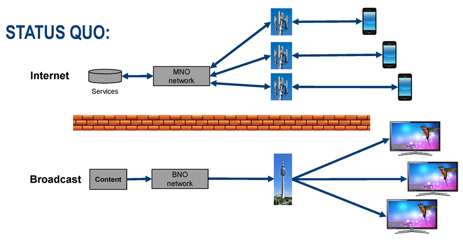 L’idea di unire il meglio dei due mondi non è nuova, e già nelle specifiche Release 9 del 3GGP fu introdotto nelle reti LTE il supporto dei protocolli eMBMS (evolved Multimedia Broadcast Multicast Service), pensati per favorire la diffusione circolare su larga scala di contenuti multimediali in diretta a una vasta platea di utenti senza intasare la rete.