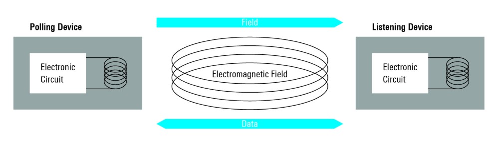 Le comunicazioni in campo vicino basano la trasmissione e la ricezione delle informazioni sull'accoppiamento induttivo. Come mostrato in figura 1, è il campo magnetico vicino di due bobine conduttrici che permette di accoppiare il dispositivo interrogante (initiator) al dispositivo interrogato (target).