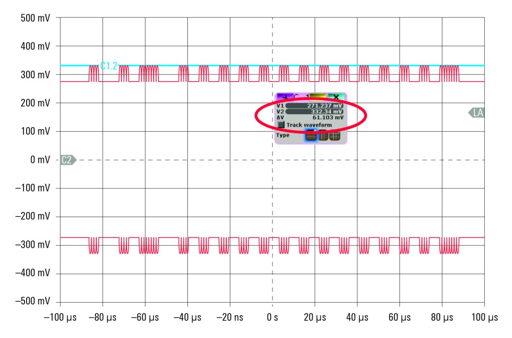 In Figura 5 è mostrata una misura di carico effettuata con un oscilloscopio digitale RTO di R&S. La risposta al telefono NFC in modalità di emulazione smart-card viene valutata con due cursori per ottenere l’esatta differenza tra i valori massimo e minimo (in questo esempio sono 61,1 mV, evidenziati nel cerchio)