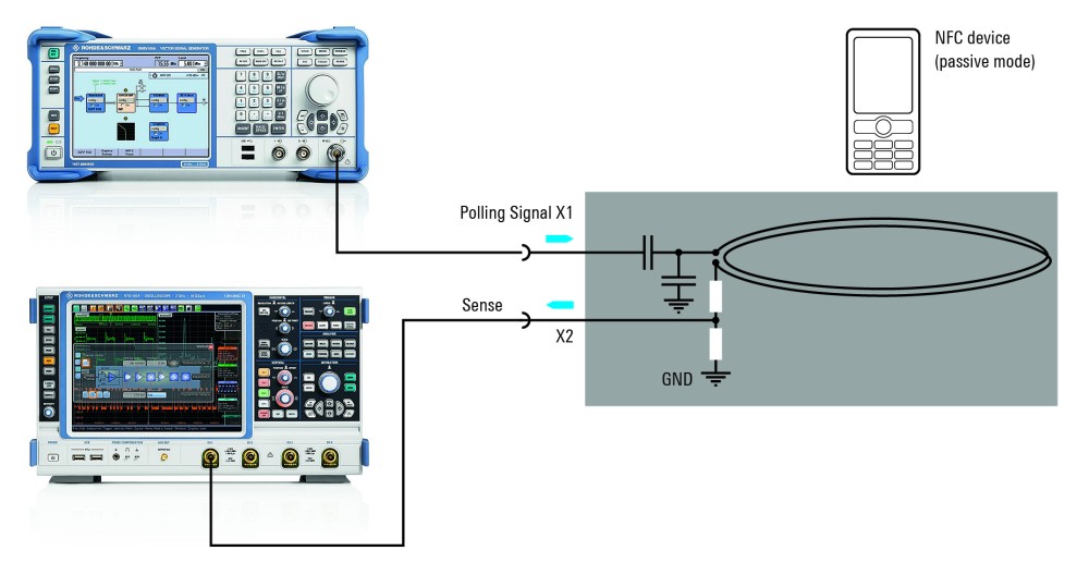 Utilizzando il dispositivo interrogante di riferimento NFC, i segnali di polling possono essere generati con un adeguato generatore di segnali RF in grado di produrre forme d'onda arbitrarie, come può esserlo il generatore SMBV100A di R&S. Le sequenze di comando che stimolano il telefonino NFC in modalità passiva sono generate dall'apposito software per la generazione di sequenze di impulsi messo a disposizione dal produttore. I segnali di prova possono essere generati e modificati con facilità.