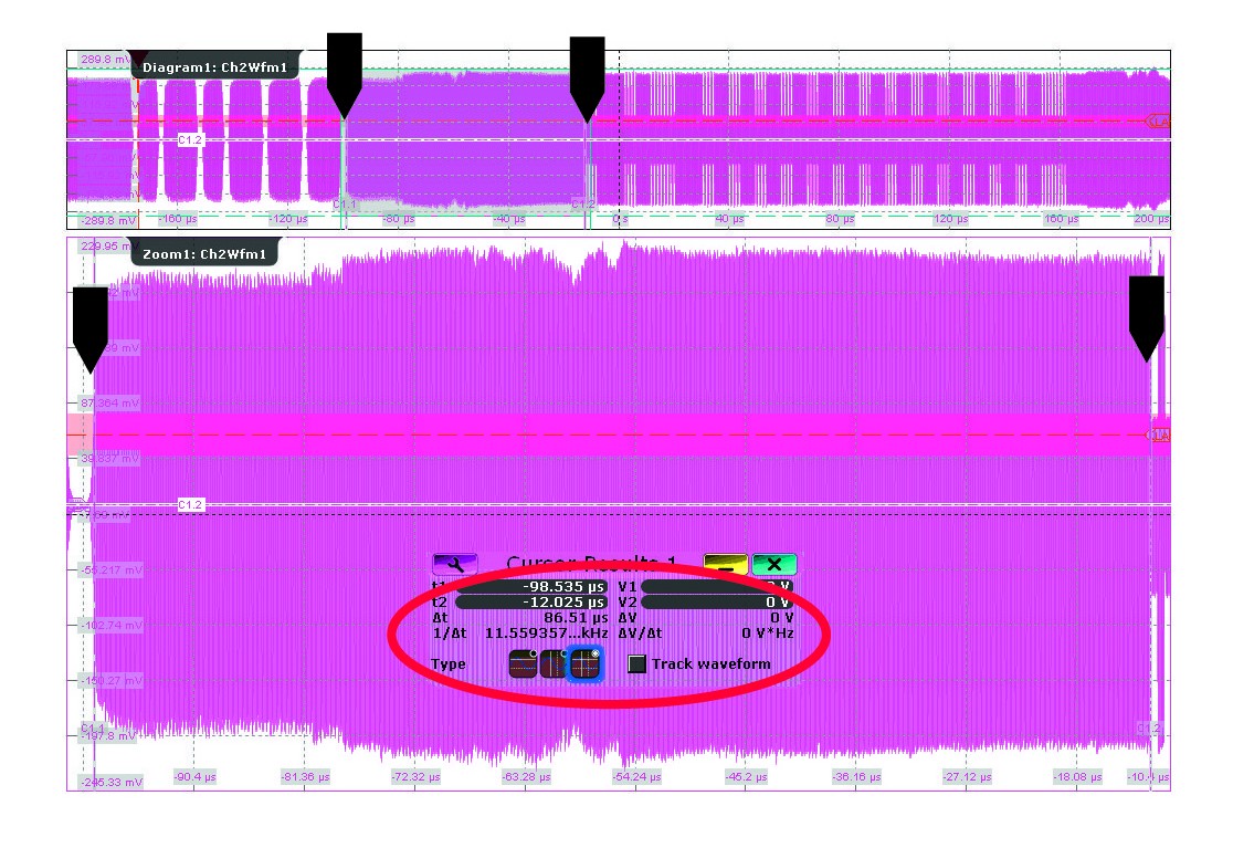La figura 4 mostra una misura temporale del ritardo di frame su un telefono NFC in modalità passiva di emulazione smart card, utilizzando la configurazione di prova riportata in figura 2. La traccia superiore mostra il segnale di Select Request (inviato da un generatore di forma d’onda arbitraria) e successivamente la risposta (modulazione del carico) del telefono NFC in modalità emulazione smart-card. La traccia inferiore mostra l’ingrandimento dell’intervallo temporale che spazia dall’ultimo bit del segnale di Select Request al primo bit della risposta. I cursori posizionati in questi punti misurano il tempo di ritardo di frame (che risulta qui essere di 86,51 µs). La variazione d’ampiezza dell’onda continua tra i cursori è dovuta ad una modulazione di carico parassita da parte del telefono NFC in modalità emulazione smart-card.