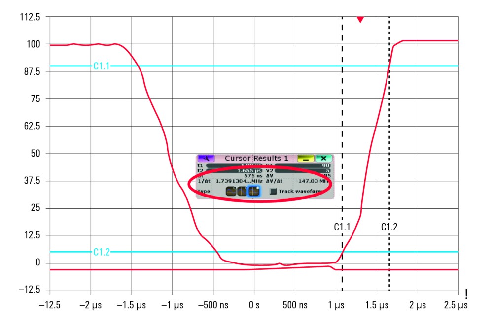 La figura 3 mostra una tipica misura sulla forma d’onda in modalità di interrogazione. Il tempo di salita è valutato in 575 ns, piazzando il cursore 1 al 5% e il cursore 2 al 90% della scala verticale.