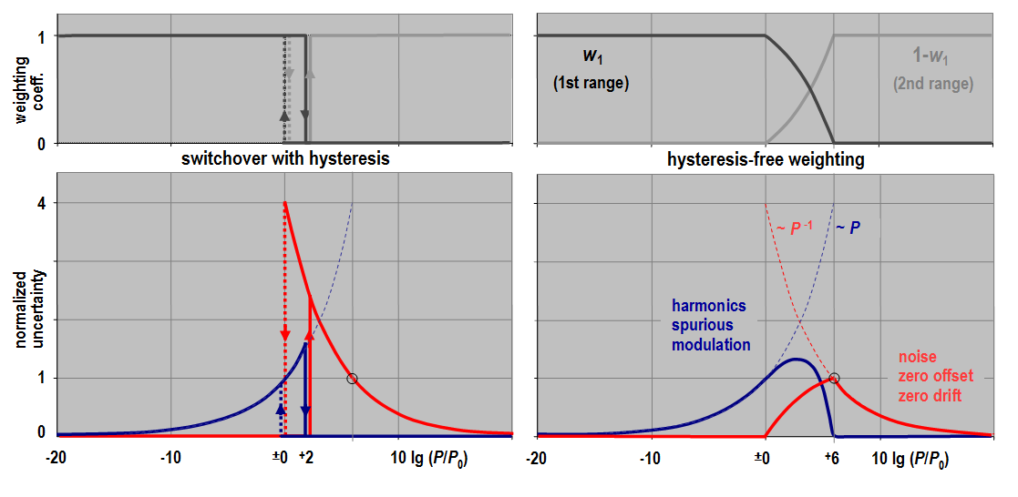 La commutazione repentina tra i vari cammini interni del rilevatore è una possibilità, ma ad essa è associato il fenomeno dell’isteresi. Si possono però adottare transizioni più graduali, come avviene all’interno dei sensori NRP-Z di Rohde & Schwarz.