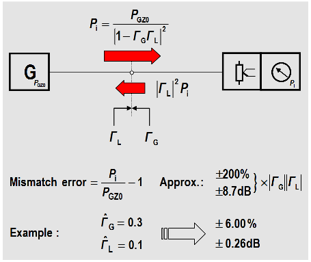 Però, le sorgenti di segnale reale riflettono una parte delle potenza incidente verso il sensore di potenza. Questa componente si sovrappone alla potenza emessa dalla sorgente e può causare una misura superiore o inferiore in funzione del suo angolo di fase rispetto al segnale principale.L’errore di misura dovuto al disadattamente può essere determinato approssimativamente mediante la seguente formula:
