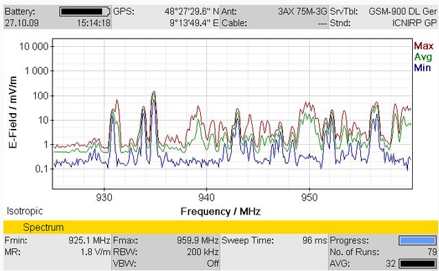 Per le misure in banda stretta (ad es. per ciascun canale GSM largo 200 kHz oppure per un canale UMTS largo 5 MHz) è necessario collegare all'antenna un analizzatore di spettro (analisi spettrale) o un analizzatore vettoriale, utile per isolare i contributi dei segnali pilota delle stazioni radio base che trasmettono a divisione di tempo.
