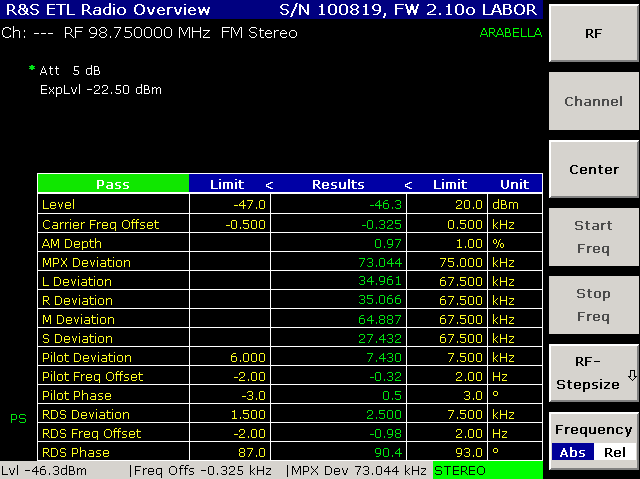 Una finestra panoramica mostra i più importanti parametri quali livello del segnale, offset di frequenza, informazioni sulle portanti pilota, sistemi dati (RDS) e deviazione di frequenza. Inoltre, la visualizzazione dello spettro audio e della visualizzazione nel dominio del tempo in banda audio offre una rapida panoramica delle caratteristiche di base di un segnale FM.