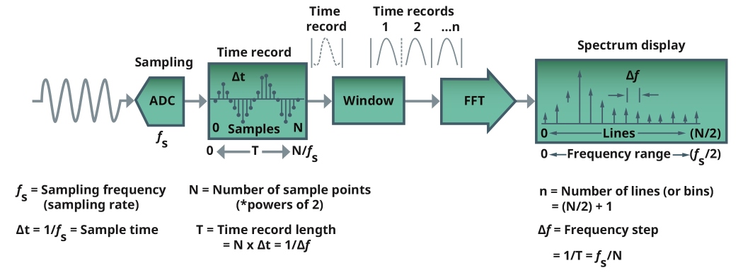 Qualsiasi porzione o intervallo del segnale misurato acquisito come serie di dati temporali relativi alla forma d'onda può essere immediatamente letta e analizzata mediante elaborazione digitale. L'implementazione dell'elaborazione digitale mediante Fast Fourier Transform (FFT) nel dominio della frequenza cattura lo spettro nell'intervallo di tempo corrispondente.