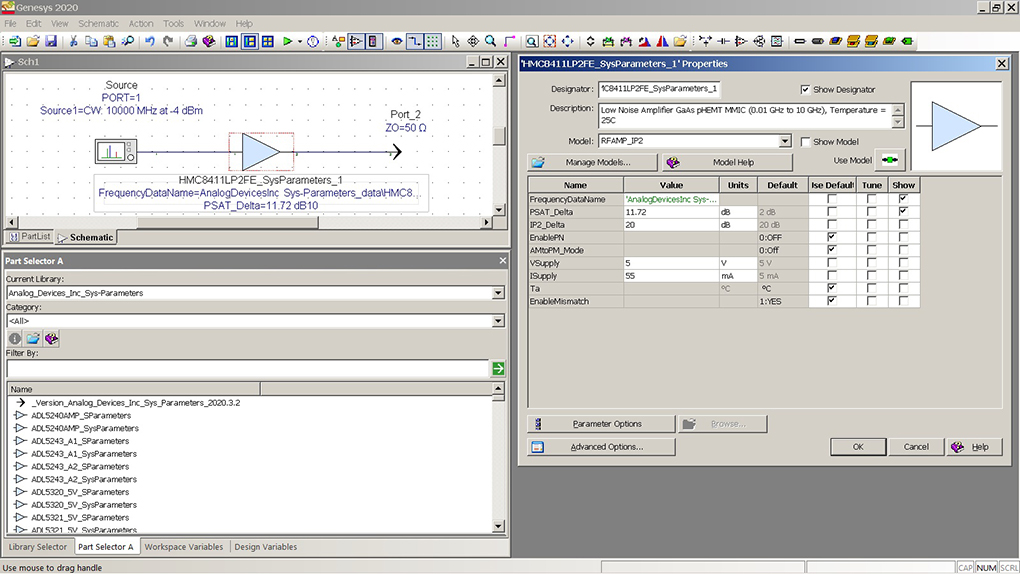 Analog Devices dispone di un'ampia libreria di Sys-parameter per amplificatori RF e mixer, disponibile per il download e inclusa anche nelle installazioni di Keysight Genesys e SystemVue.