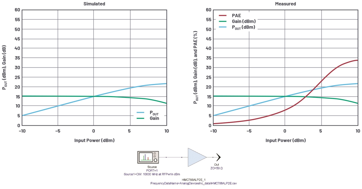 La Figura 2 mostra i risultati misurati e simulati per uno sweep di potenza a 10 GHz di HMC788A, un blocco di guadagno RF da 10 MHz a 10 GHz.