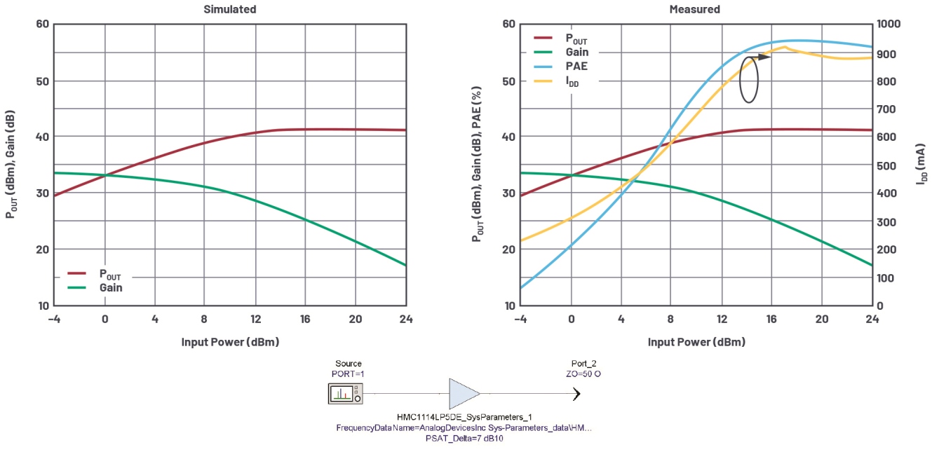 Figura 4. Sweep di potenza simulato e misurato di un HMC1114, amplificatore GaN da 10 W a 3,2 GHz.