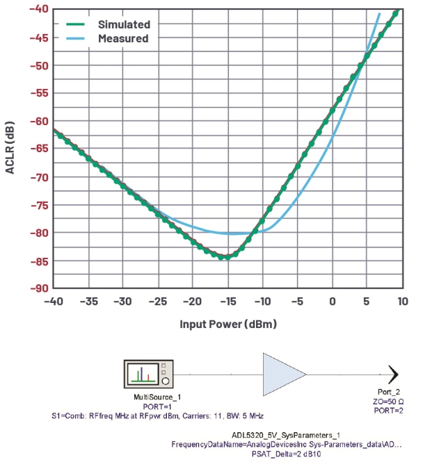 È significativo notare che i risultati di questa simulazione si basano sia sui dati del valore di rumore (a bassa potenza) che sui dati dell'IP3 (ad alta potenza) per produrre uno sweep ACLR accurato attraverso un ampio intervallo di potenza.