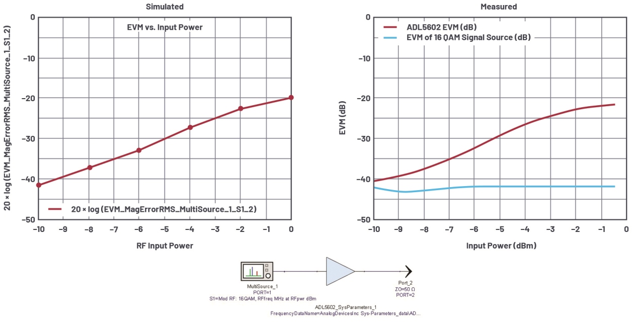 La Figura 6 mostra i risultati di uno sweep EVM misurato e simulato rispetto al livello di potenza RF dove il segnale di ingresso è una portante da 1 MSPS con modulzione 16 QAM che pilota il circuito integrato ADL5602 di Analog Devices, un blocco di guadagno a banda larga da 50 MHz a 4 GHz.
